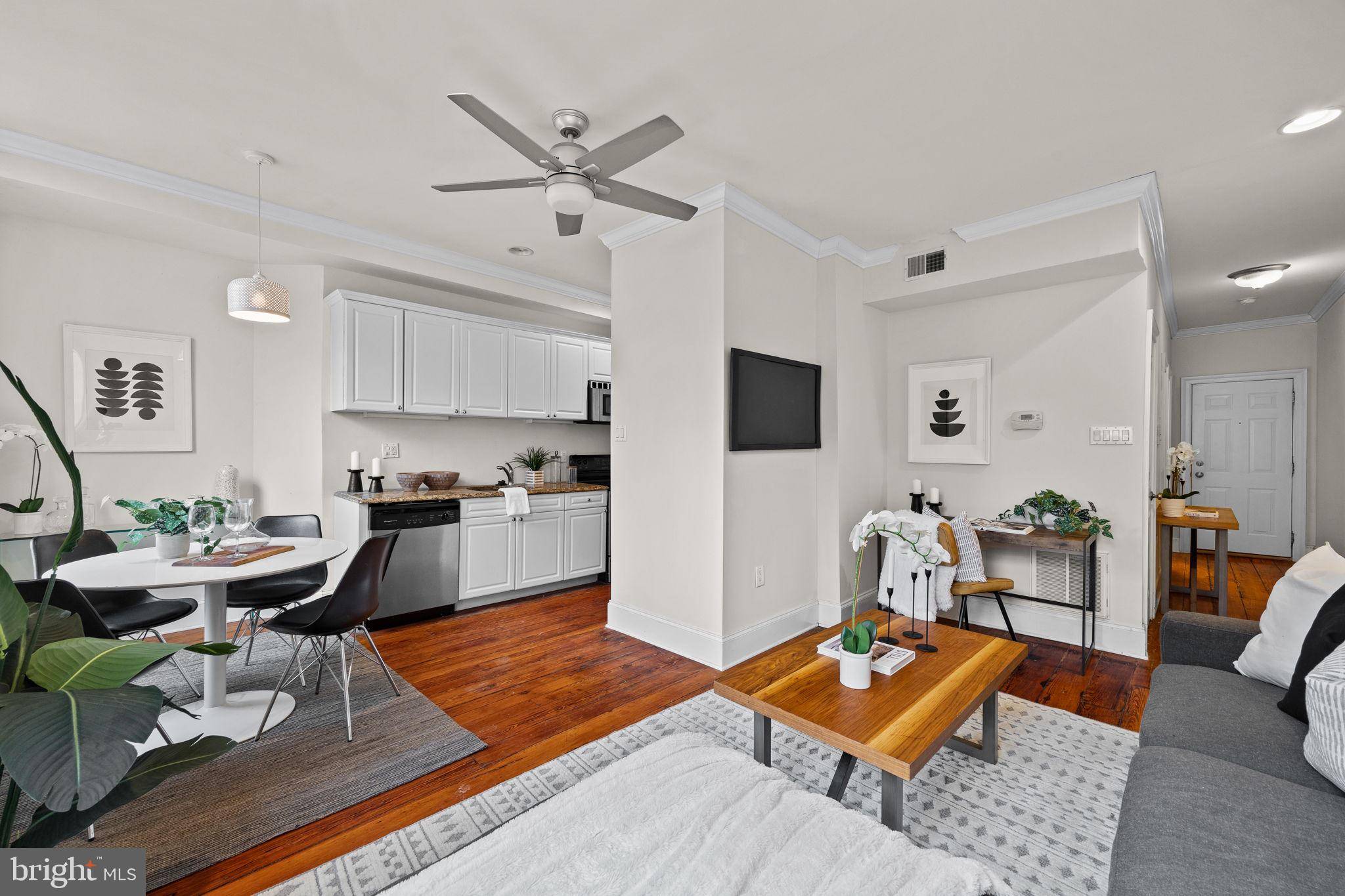 Inside this beautifully arranged home, tall ceilings rise above restored original pine floors, crown molding and oversized six-over-six windows framing open-sky and treetop outlooks. A gracious entry hall flanked by a roomy coat closet ushers you into an open living/dining area with recessed and pendant lighting. Ahead, the updated kitchen features rows of white cabinetry, granite countertops, and full-size stainless steel appliances, including a range, dishwasher and built-in microwave. Sleep soundly in the spacious bedroom, featuring great closet space and plenty of room for a reading nook or office area. A full bathroom with a large tub/shower and large vanity completes the layout, while additional basement storage adds wonderful convenience to this charming Rittenhouse haven.
